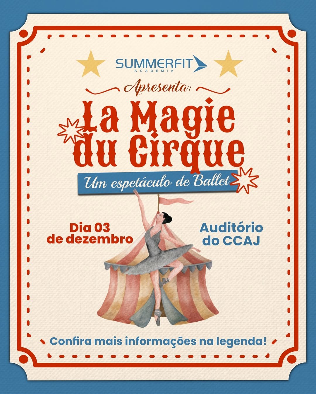 O tradicional espetáculo de fim de ano da Summer Fit está prestes a ganhar os palcos de Jataí com uma apresentação repleta de cores, emoção e atmosfera nostálgica. Com o tema circo vintage, o evento intitulado “La Magie du Cirque” reunirá todas as turmas de ballet da academia para uma noite especial, marcada pelo talento das bailarinas e pela magia que envolve o universo circense.