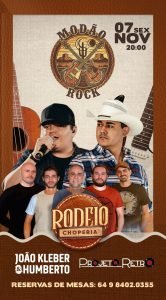A cidade de Jataí se prepara para uma noite de muita música e animação com o evento Modão Rock, que acontece nesta sexta-feira (7), a partir das 20h, na Rodeio Choperia. A programação traz duas grandes atrações locais: João Kléber Humberto e o grupo Projeto Retrô, que prometem embalar o público com um repertório que mistura o melhor do sertanejo com clássicos do rock nacional e internacional.