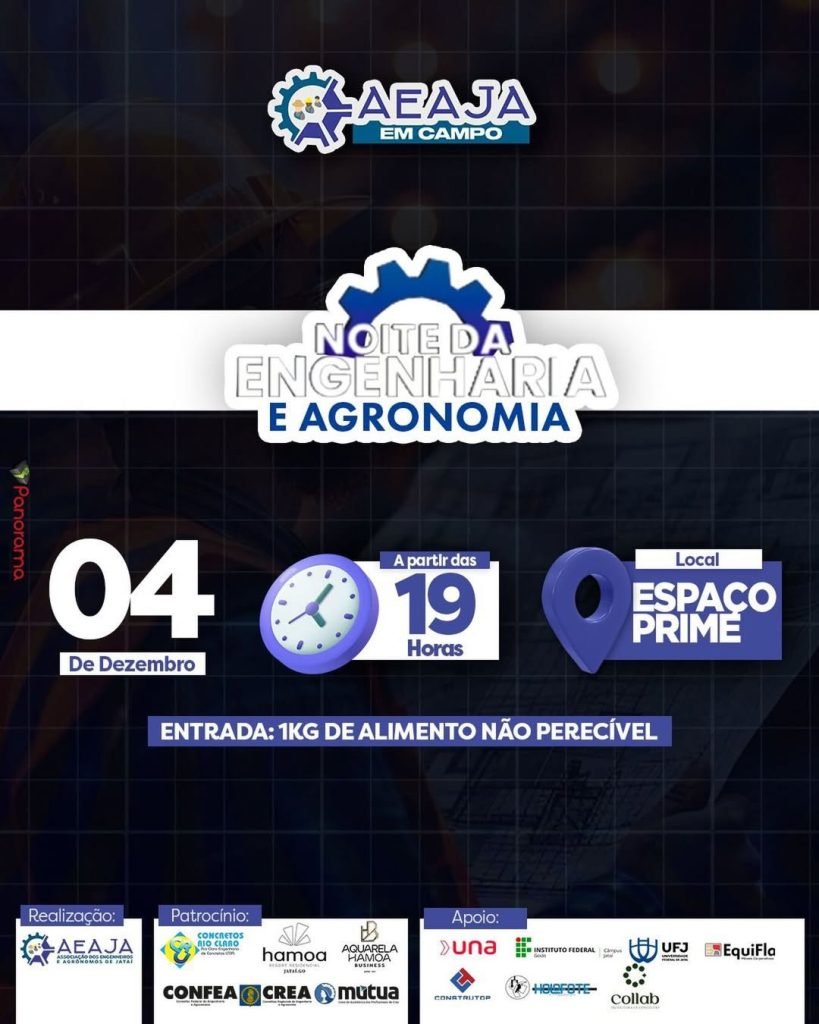 Promovido pela Associação dos Engenheiros, Arquitetos e Agrônomos de Jataí (AEAJA), o encontro contará com o apoio de parceiros que atuam diretamente no fortalecimento da classe. A entrada será 1kg de alimento não perecível, reforçando a proposta solidária da iniciativa.