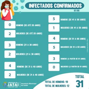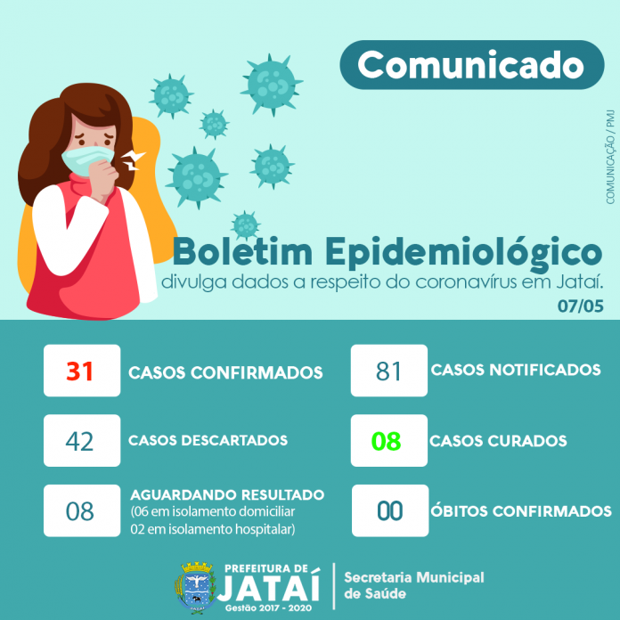 A Secretaria Municipal de Saúde, através do Núcleo de Vigilância Epidemiológica informa que em Jataí foram notificados 81 casos suspeitos de Covid-19 até a presente data, destes 31 foram confirmados, 42 descartados e 08 aguardam resultado do exame.
