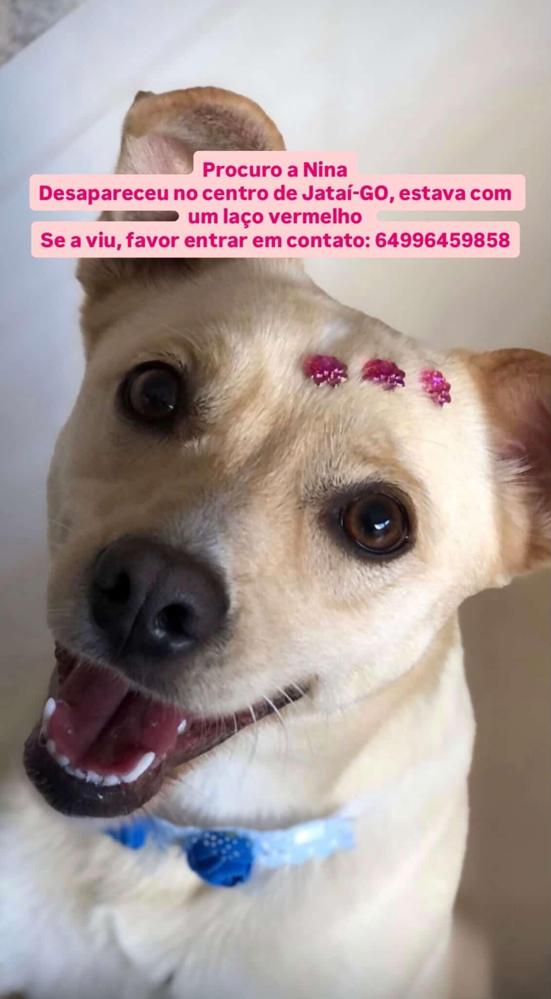 Uma cachorrinha está desaparecida desde a tarde desta sexta-feira (26), por volta das 16h30, no Centro de Jataí, no Sudoeste de Goiás. O caso tem gerado grande mobilização nas redes sociais e grupos de WhatsApp da cidade, com o objetivo de localizar o animal o quanto antes.