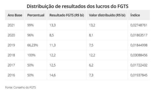 No ano passado, foram distribuídos R$ 8,12 bilhões. O valor representou 96% do lucro líquido registrado em 2020. Já em 2020, o FGTS distribuiu cerca de R$ 7,5 bilhões aos trabalhadores, o que correspondeu a 66,2% do lucro de 2019.