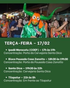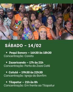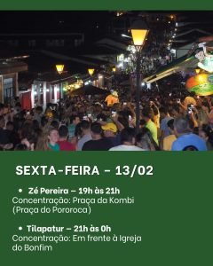 • Zé Pereira – das 17h às 22h. Concentração na Praça do Elzi Aires
