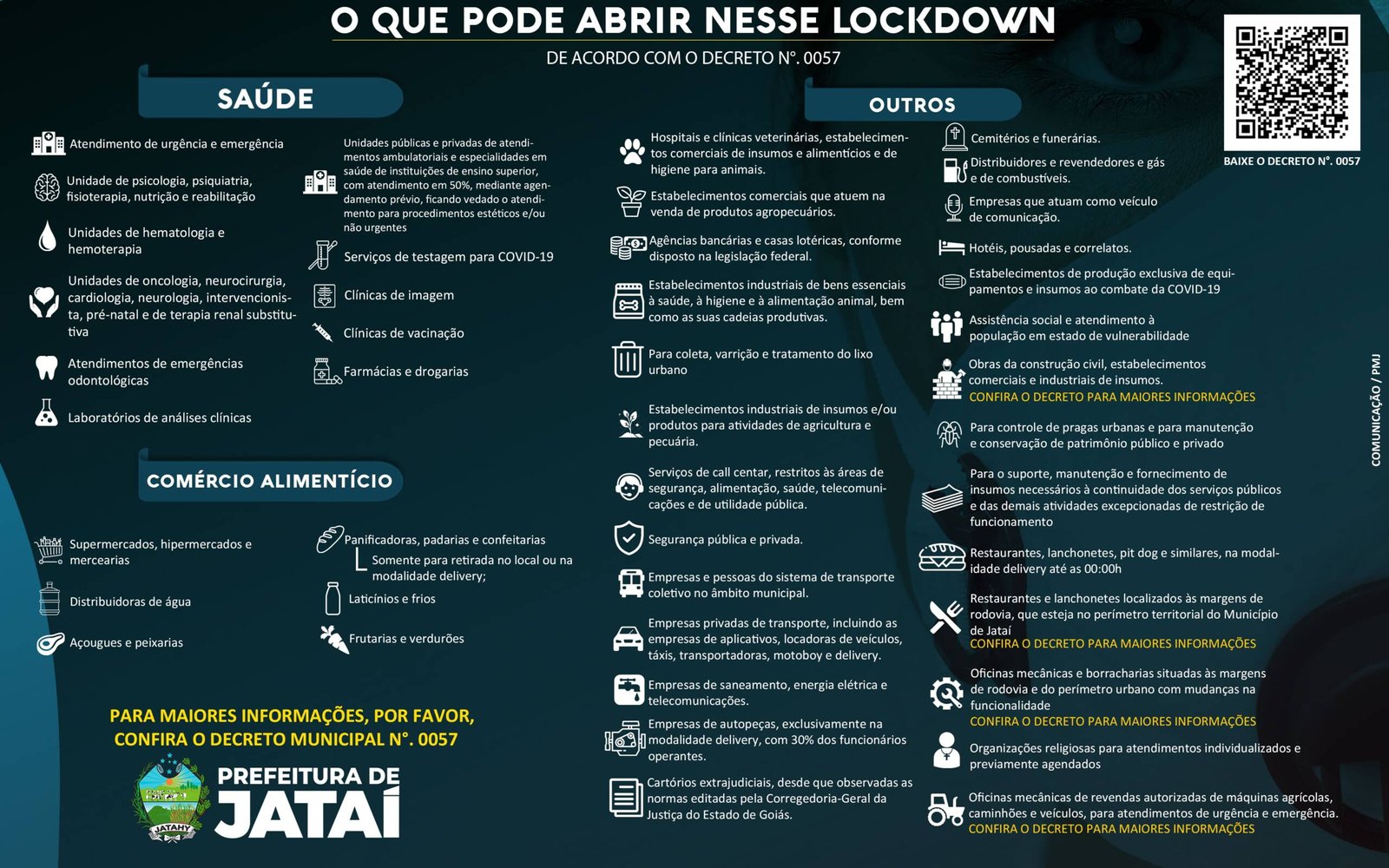 Nesta segunda-feira (01), entrou em vigor o Decreto Municipal Nº. 0057, dispõe sobre a suspensão total das atividades não essenciais e da circulação de pessoas e veículos particulares (lockdown), no âmbito do Município de Jataí, a partir das 0h do dia 3 de março de 2021 até as 06h do dia 9 de março de 2021 e dá outras providencias.