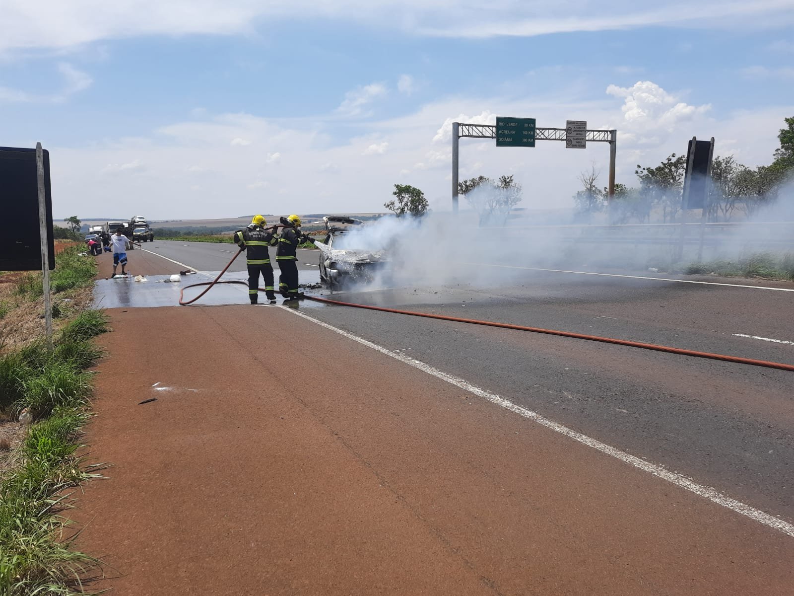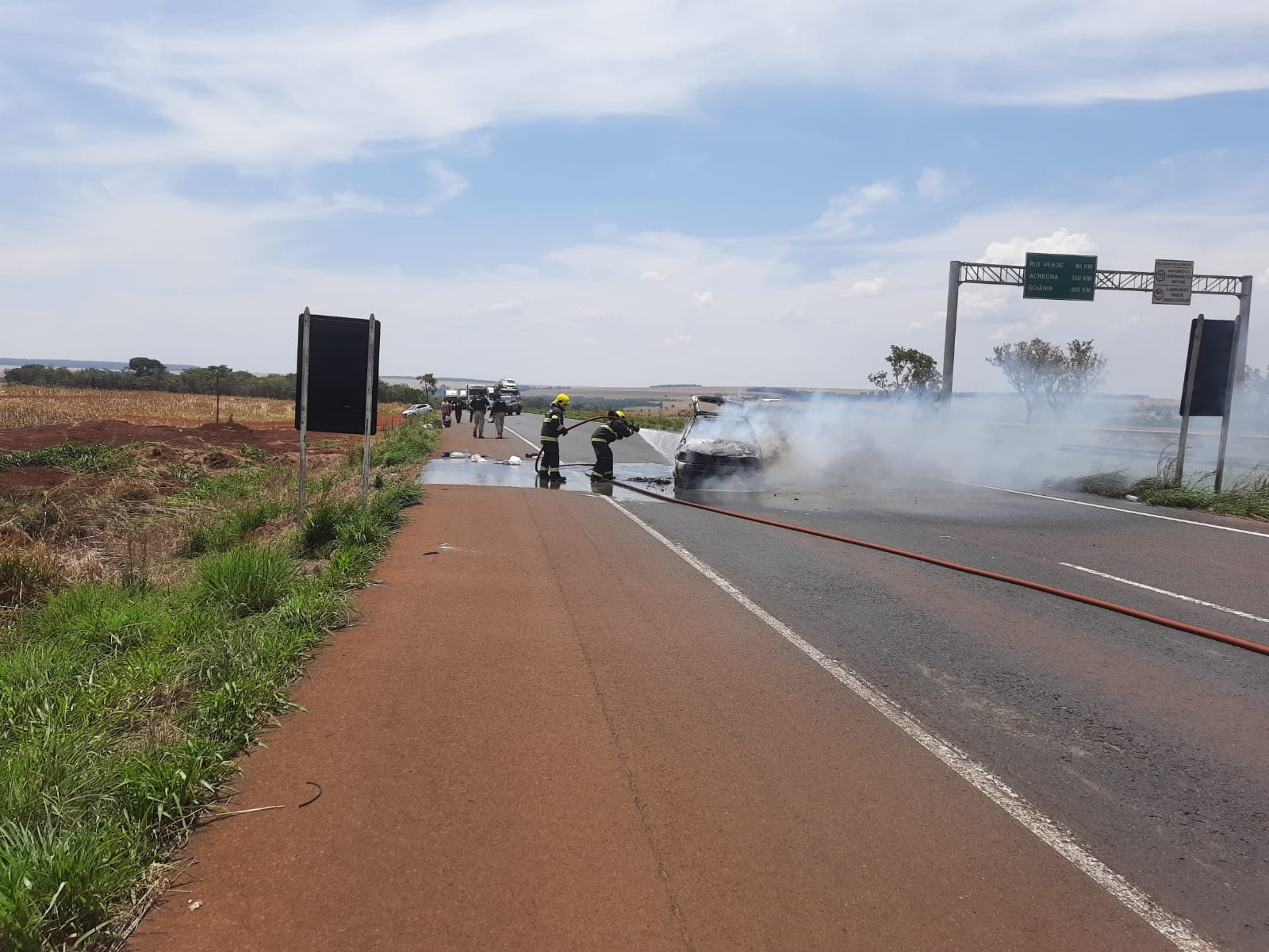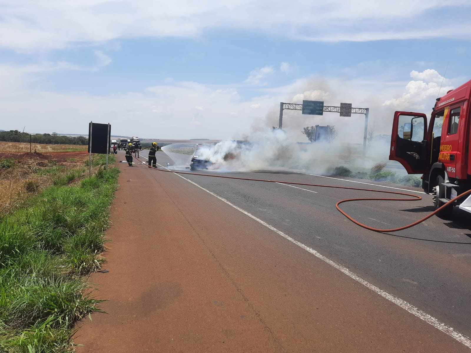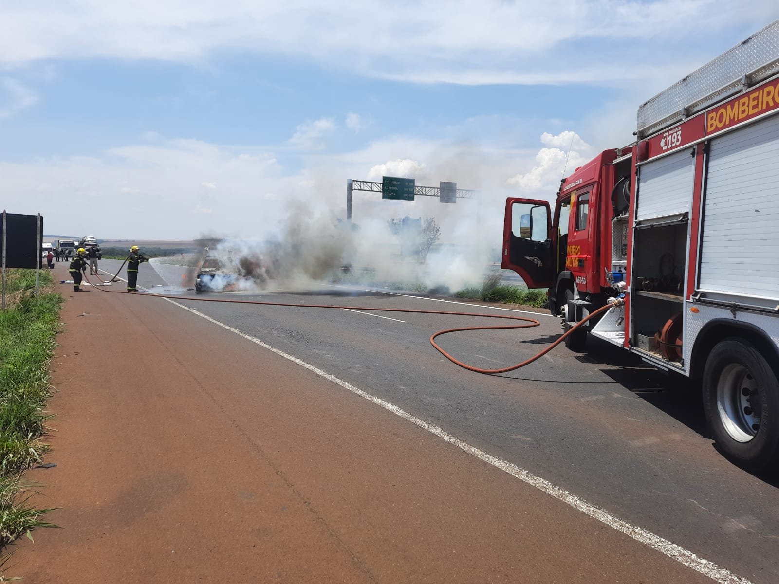 Os Bombeiros conseguiram extinguir o incêndio, que já havia consumido boa parte do veículo.