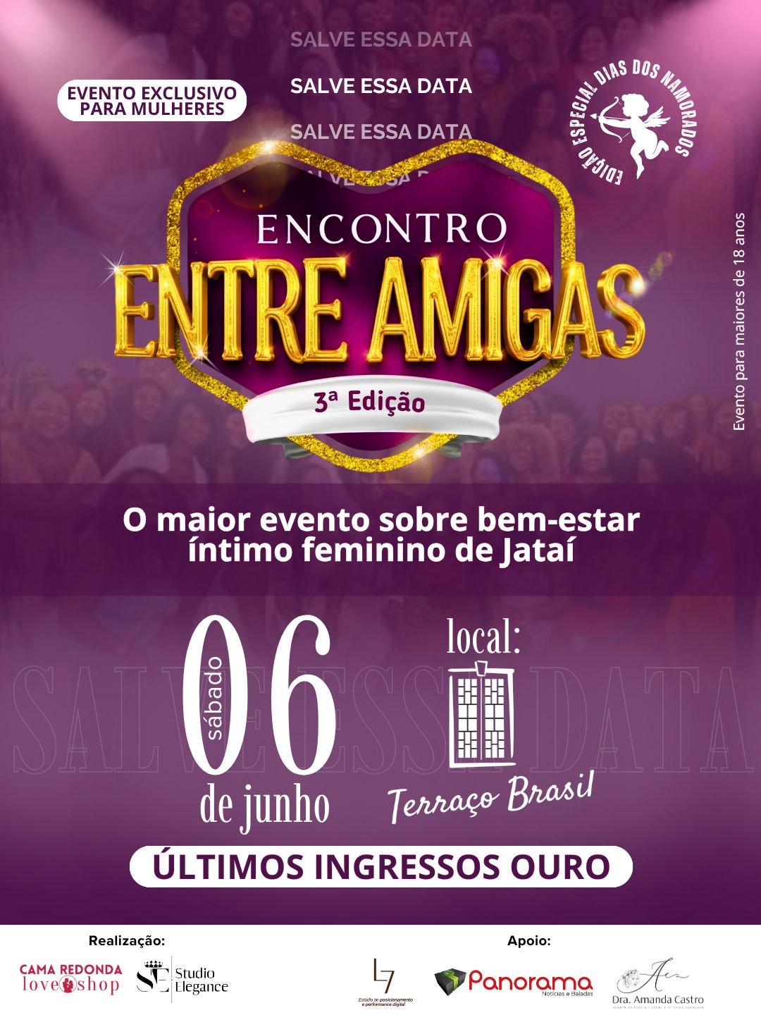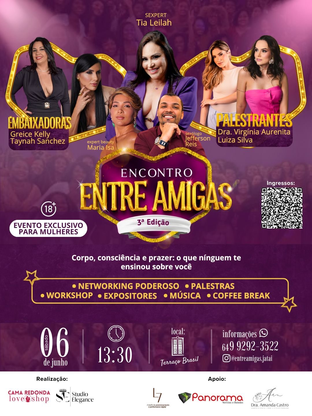 O Encontro Entre Amigas chega à sua 3ª edição consolidado como um dos principais eventos voltados ao bem-estar íntimo feminino em Jataí. A programação será realizada no dia 6 de junho de 2026, das 13h30 às 19h, no Terraço Brasil, reunindo mulheres em um ambiente exclusivo de aprendizado, troca e conexão.