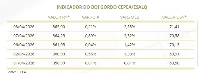 Esse cenário indica um ambiente de firmeza nas cotações, com influência direta do mercado internacional sobre a dinâmica doméstica da pecuária.