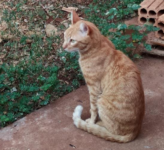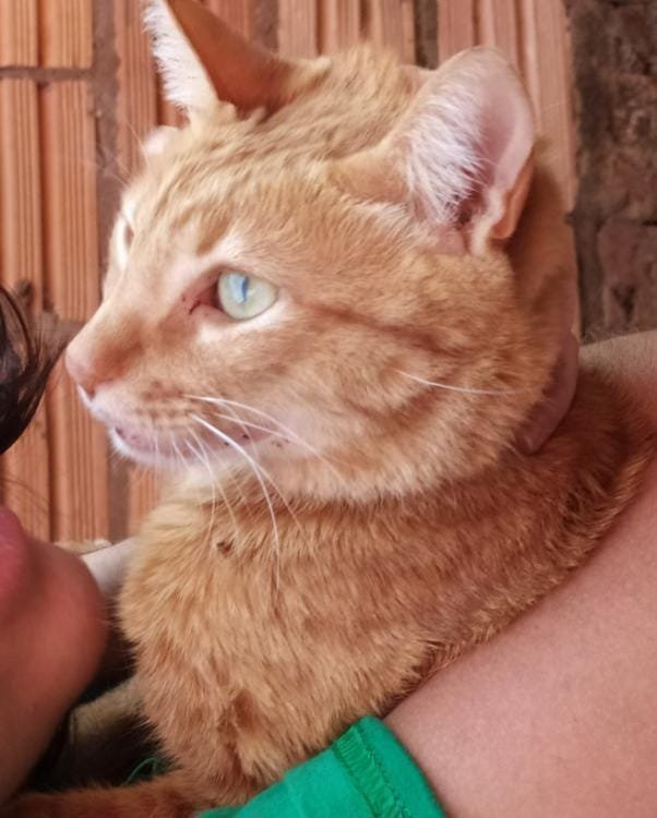 O gato é de cor amarela, tem cerca de 7 anos e não tem os dentes.