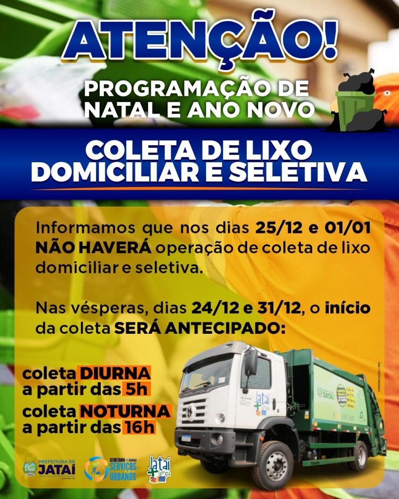 A Prefeitura de Jataí, por meio da Secretaria de Serviços Urbanos, comunica formalmente à população as alterações no cronograma dos serviços de coleta de lixo domiciliar e seletiva durante o período das festas de fim de ano. Dessa forma, a administração municipal busca garantir que a cidade permaneça limpa e organizada, solicitando, portanto, atenção total dos moradores para as novas datas.
