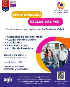 O Hospital Estadual de Jataí Doutor Serafim de Carvalho, em parceria com a Associação de Gestão, Inovação e Resultados em Saúde (Agir Saúde), está com inscrições abertas para vagas de trabalho destinadas exclusivamente a pessoas com deficiência (PcD).