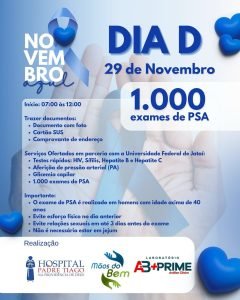 O Hospital Padre Tiago realiza, no dia 29 de novembro, o Dia D do Novembro Azul. A mobilização incentiva os homens a cuidarem da própria saúde e reforça a importância da prevenção. A iniciativa reúne a Associação Mãos do Bem, a Universidade Federal de Jataí (UFJ) e o Laboratório AB Prime. As atividades ocorrem das 7h às 12h, no hospital.