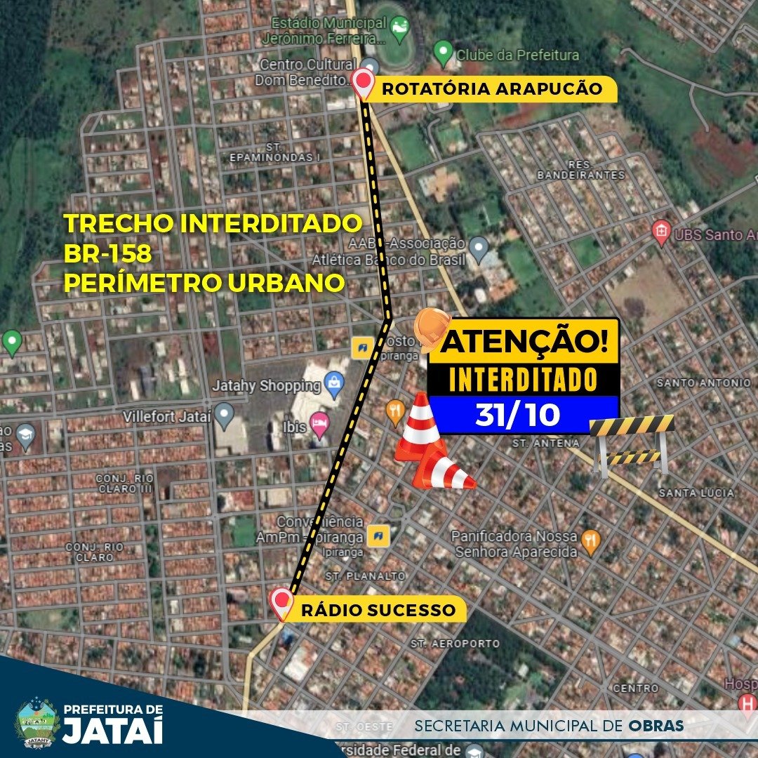 A Prefeitura de Jataí informa que, nesta terça-feira (31), o perímetro urbano da BR-158 estará interditado, do cruzamento com a Rua Tocantins até o cruzamento com a Rua 10. A interdição é necessária para a aplicação do CBUQ (Concreto Betuminoso Usinado a Quente).