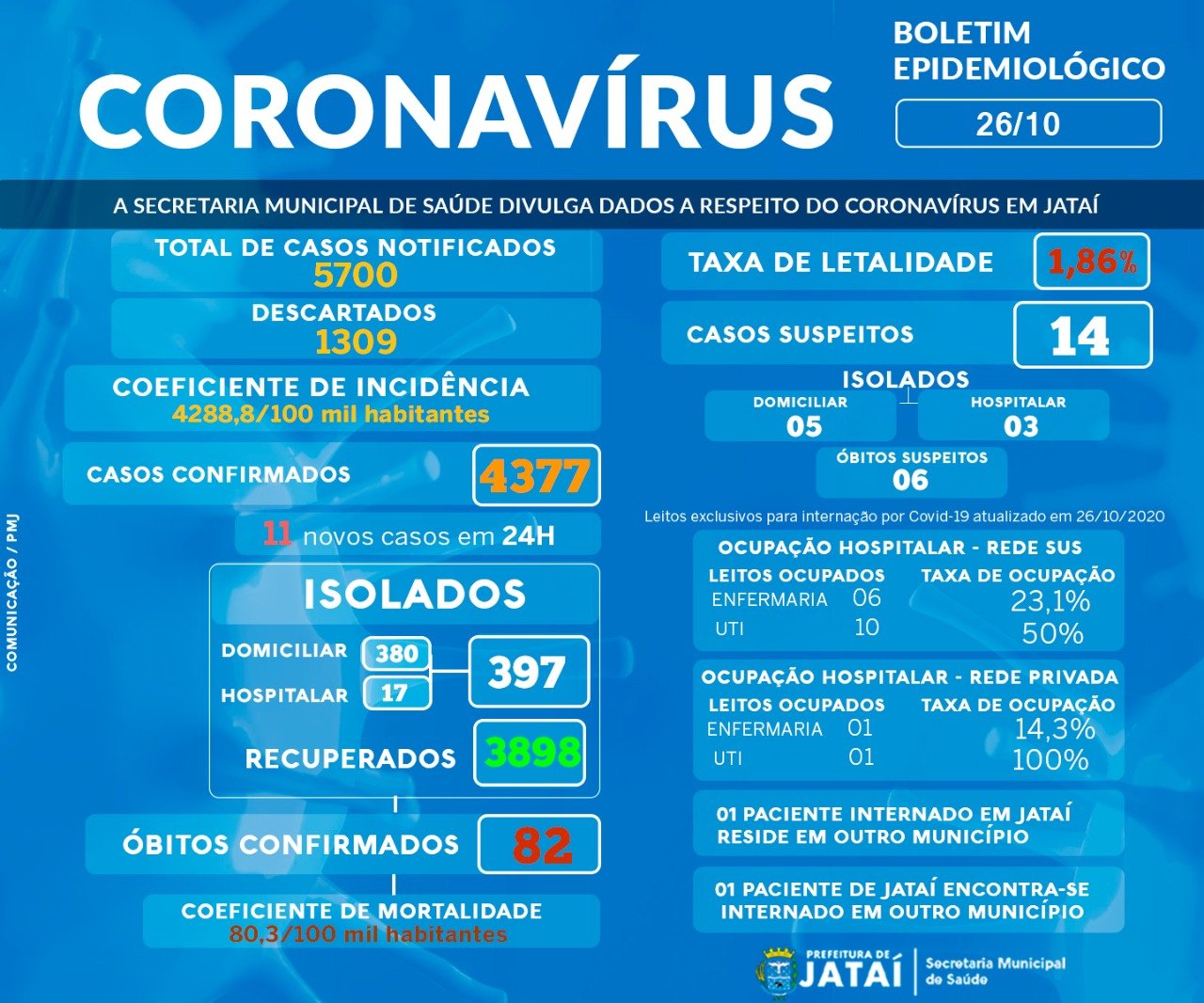 A Prefeitura de Jataí, através de sua Secretaria Municipal da Saúde, informa que em Jataí foram notificados um total de 5.700 casos de Covid-19 e confirmados 4.377 casos até a presente data, destes, 17 estão internados e outros 14 suspeitos, sendo que temos 01 paciente internado em Jataí que reside em outro município e 01 paciente de Jataí encontra-se internado em outro município. Dos 4.377 casos confirmados, 3.889 estão recuperados e 82 óbitos foram confirmados pela doença.