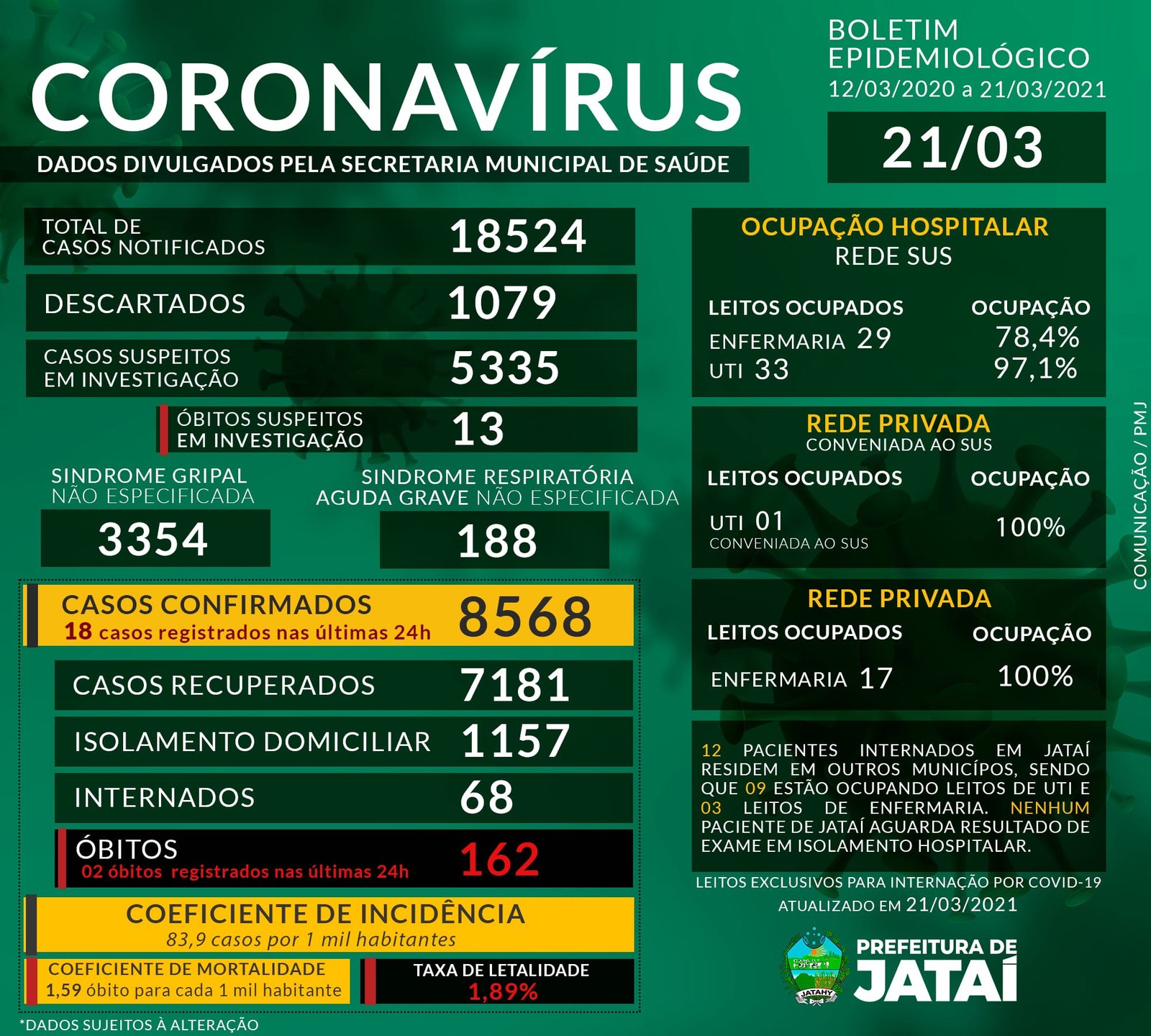 A Prefeitura de Jataí, através da Superintendência de Vigilância em Saúde informa que desde o início da pandemia em Jataí até a presente data, foram notificados 18.524 casos suspeitos de COVID-19. Destes, 1.079 foram descartados, 5.335 casos suspeitos de COVID-19 estão em investigação (destes, 13 foram a óbito), 3.354 casos foram encerrados como Síndrome Gripal Não Especificada e outros 188 casos foram encerrados como Síndrome Respiratória Aguda Grave Não Especificada. Do total de casos notificados, 8.568 foram confirmados como COVID-19, destes, 18 foram registrados nas últimas 24 horas.
