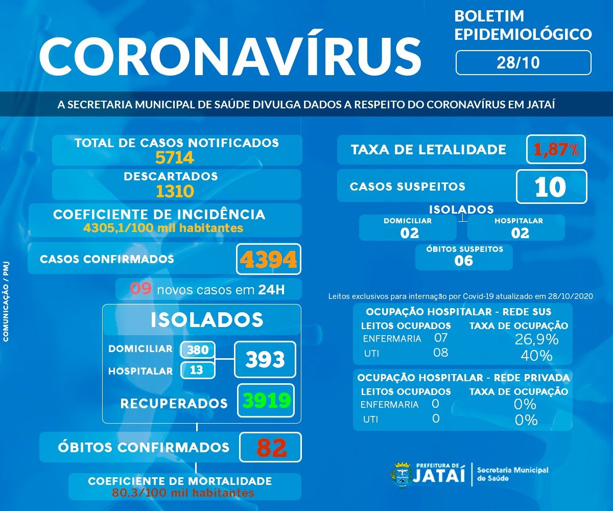 A Prefeitura de Jataí, através de sua Secretaria Municipal da Saúde, informa que em Jataí foram notificados um total de 5.714 casos de Covid-19 e confirmados 4.394 casos até a presente data, destes, 13 estão internados e outros 10 suspeitos. Dos 4.394 casos confirmados, 3.919 estão recuperados e 82 óbitos foram confirmados pela doença.