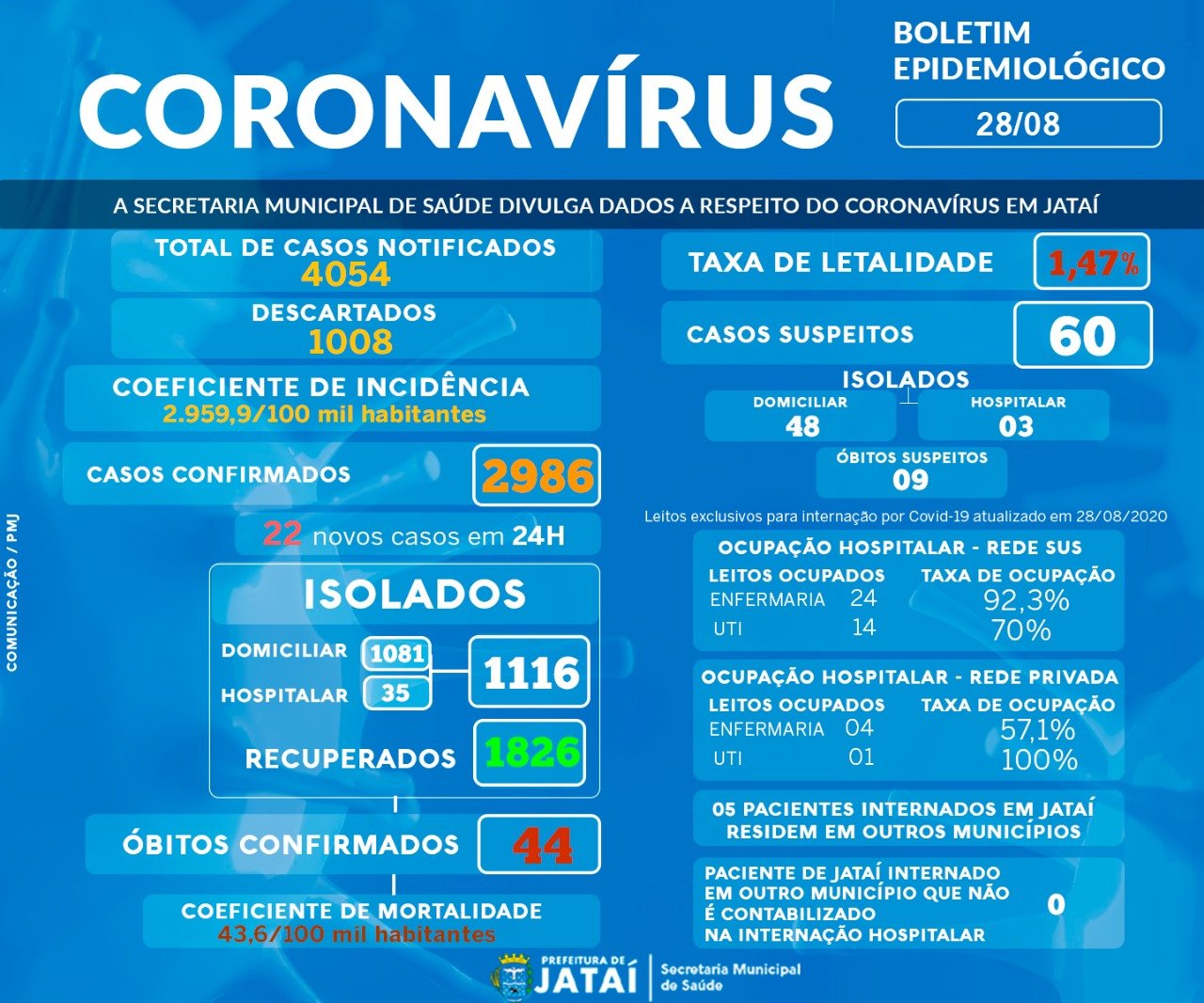 A Secretaria Municipal de Saúde, através do Núcleo de Vigilância Epidemiológica informa que em Jataí foram notificados um total de 4.054 casos de Covid-19 e confirmados 2.986 casos até a presente data, destes, 35 estão internados e outros 60 suspeitos, sendo que temos 05 pacientes internados em Jataí que residem em outro município, portanto, não entra na contabilização de leitos do município. Dos 2.986 casos confirmados, 1.826 estão recuperados e 44 óbitos foram confirmados pela doença.
