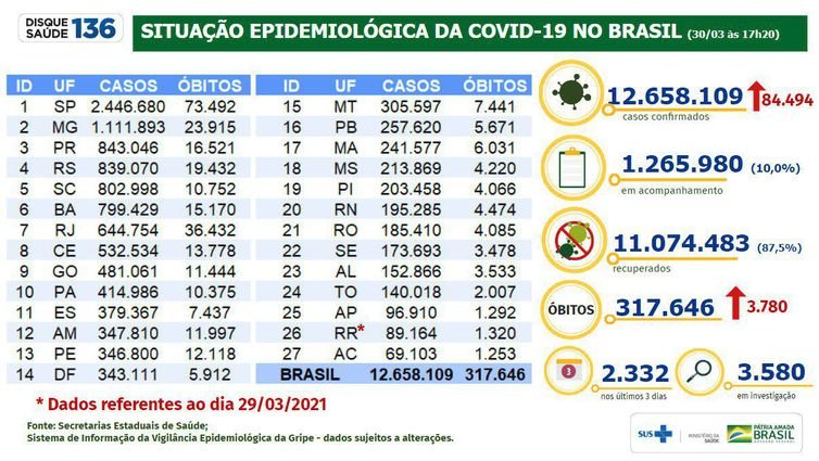 Já o total de pessoas infectadas pelo novo coronavírus desde o início da pandemia chegou a 12.658.109. Entre o dia (29) e ontem (30), foram confirmados 84.494 novos diagnósticos.
