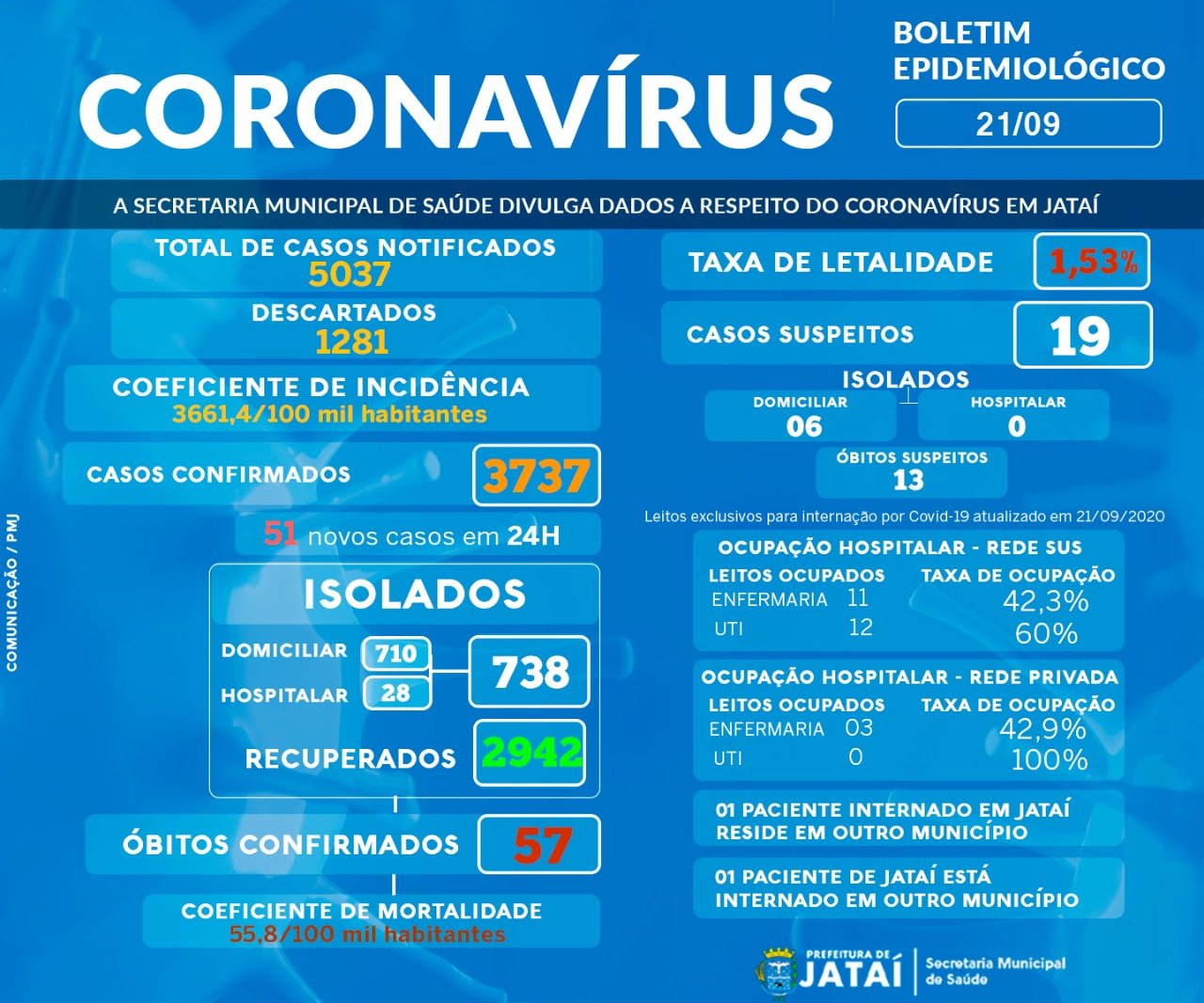 A Prefeitura de Jataí, através de sua Secretaria Municipal da Saúde, informa que em Jataí foram notificados um total de 5.037 casos de Covid-19 e confirmados 3.737 casos até a presente data, destes, 28 estão internados e outros 19 suspeitos, sendo que temos 01 paciente internado em Jataí que reside em outro município e 01 paciente de Jataí que se encontra internado em outro município, portanto, não entra na contabilização de leitos do município. Dos 3.737 casos confirmados, 2.942 estão recuperados e 57 óbitos foram confirmados pela doença.