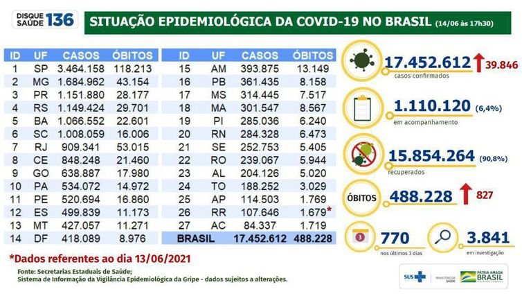 O número de pessoas que não resistiram ao novo coronavírus alcançou 488.228. Nas últimas 24 horas, foram confirmados 827 novos óbitos. Dia (13), o número de óbitos decorrentes de complicações relacionadas à covid-19 estava em 487.401.