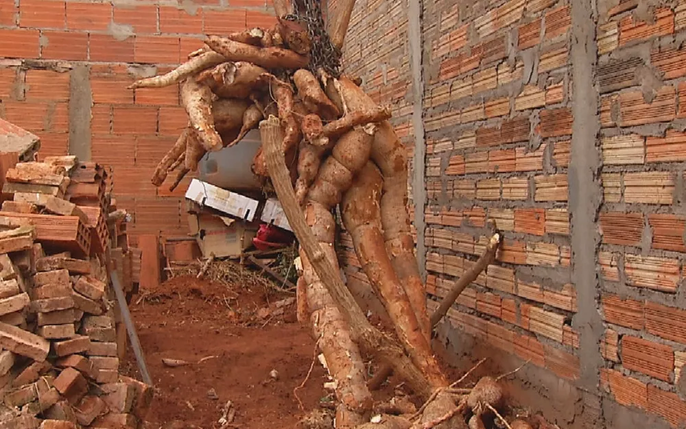 O aposentado João dos Santos precisou de um guincho manual para colher uma raiz de mandioca de cerca de 300 kg, em Rio Verde, região sudoeste de Goiás. Ele conta que plantou a raiz no quintal de casa há 8 anos.