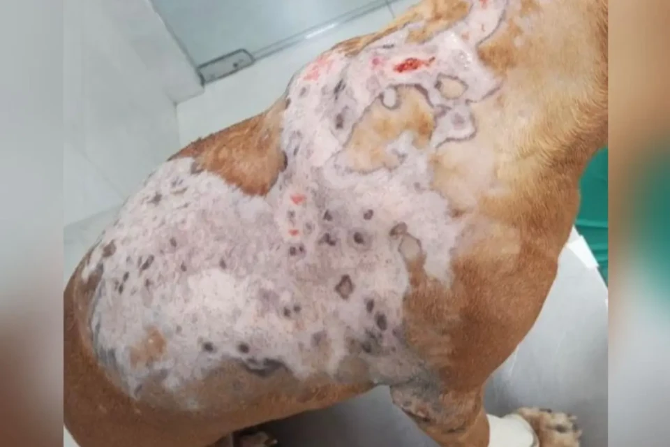 Devido à extensão dos ferimentos, o cão apresentou quadro de infecção secundária e complicações sistêmicas graves, chegando a necessitar de suporte de oxigênio durante a internação, ainda correndo risco de morte.