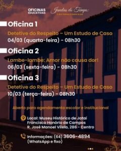 Entre as ações, destaca-se a oficina “Detetive do Respeito: Um Estudo de Caso”, que acontece nos dias 04 e 10 de março. Já no dia 06 de março, o público participa da oficina “Lambe-lambe: Amor não causa dor!”. Em todos os dias, as atividades começam às 08h30.