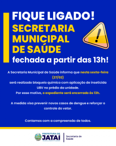 A Prefeitura de Jataí informou que a Secretaria Municipal de Saúde realizará, nesta sexta-feira (27/02), um bloqueio químico com aplicação de inseticida a Ultrabaixo Volume (UBV) nas dependências do prédio administrativo do município, em Jataí (GO).