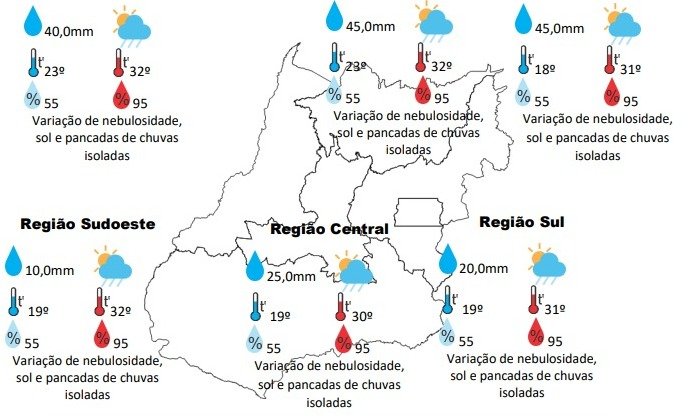 Em Jataí, a sexta-feira deve ter variação de nebulosidade, sol e pancadas de chuvas isoladas, com temperaturas que variam entre 20ºC e 30ºC e umidade relativa do ar variando entre 55% e 95%. Em Rio Verde, a previsão é semelhante, com temperaturas que variam entre 20ºC e 30ºC e umidade relativa do ar variando entre 55% a 95%. Por fim, em Mineiros, a sexta-feira deve ter sol com algumas nuvens. Chove rápido durante o dia e à noite, com temperaturas que variam entre 20ºC e 29ºC e umidade relativa do ar variando entre 57% a 100%.