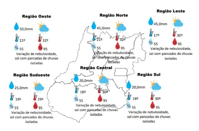 De acordo com a previsão, a ainda com o transporte de umidade da região norte do pais que combinado com o calor, vai favorecer a formação de áreas de instabilidade, consequentemente teremos pancadas de chuvas isoladas, acompanhadas de rajadas de vento e raios. A capital do estado deve ter variação de nebulosidade, sol e pancadas de chuvas, temperatura máxima podendo chegar aos 29ºC e umidade relativa do ar variando entre 55% a 95%, o nascer do sol será às 06:21hs e o pôr do sol às 18:27hs.