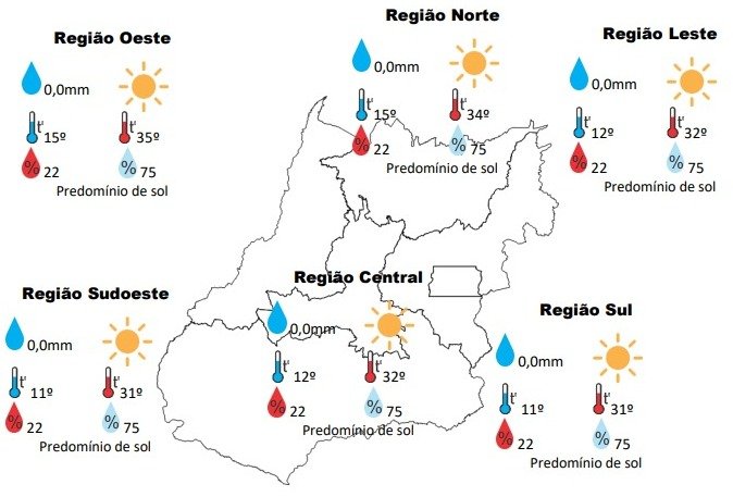 Quarta-feira, com a atuação de uma massa de ar seco e quente sobre o Brasil central, que vai propiciar o predomínio de sol em todas as regiões do Estado de Goiás, as temperaturas máximas em elevação, mínimas baixas pela manhã, o destaque fica para umidade relativa do ar, que estará em declínio no período da tarde. Capital: predomínio de sol, temperatura máxima podendo chegar aos 31ºC e umidade relativa do ar variando entre 22% a 75%, o nascer do sol será às 06:44hs e o pôr do sol às 18:02hs.
