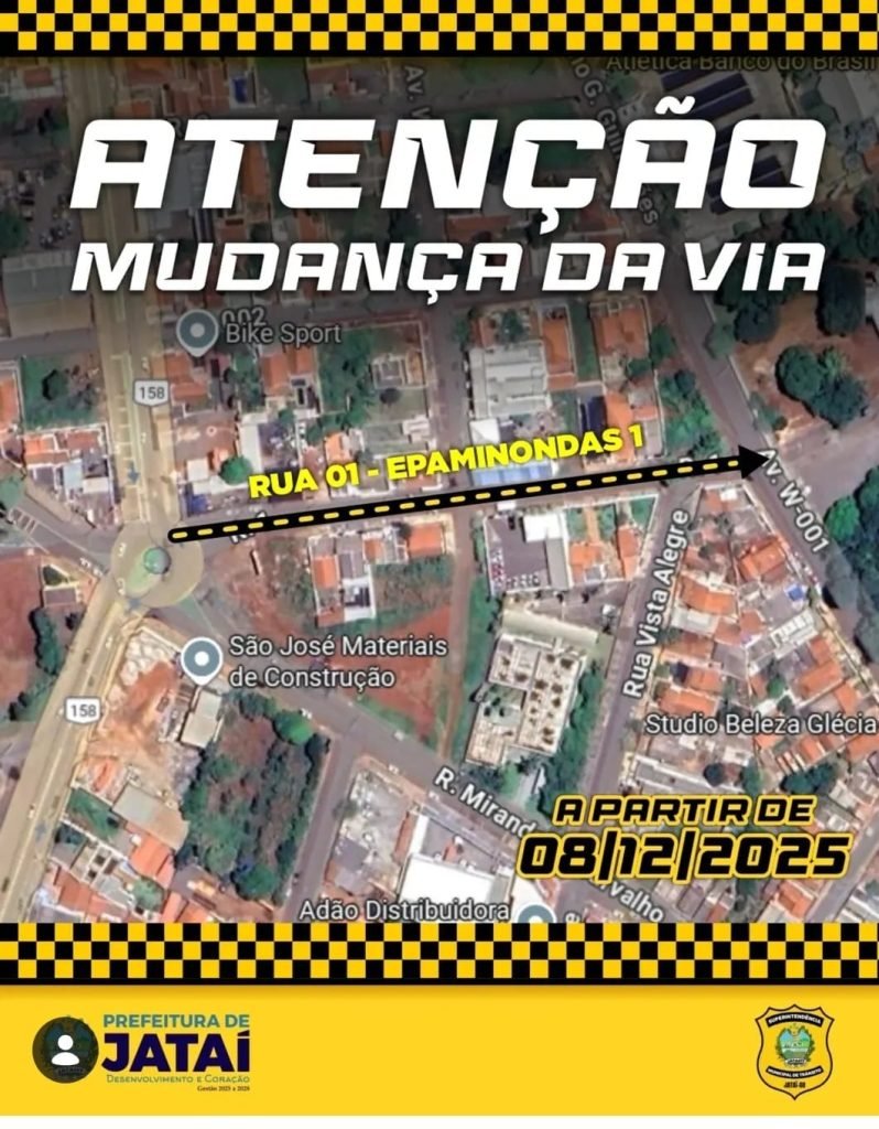 A Superintendência Municipal de Trânsito (SMT) informou que, a partir da próxima segunda-feira, 8 de dezembro de 2025, a Rua 01, localizada no Setor Epaminondas I, passará a operar em sentido único, no sentido descendente, em direção à AABB. A mudança integra o conjunto de ajustes implementados pela pasta com o objetivo de reorganizar o fluxo de veículos e garantir maior segurança aos motoristas que transitam pela região.