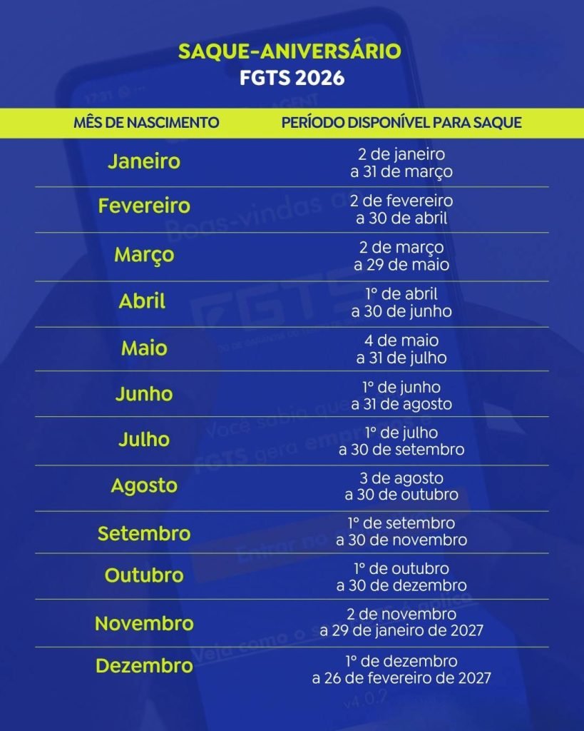 Saque-aniversário do FGTS: calendário de pagamentos em 2026
