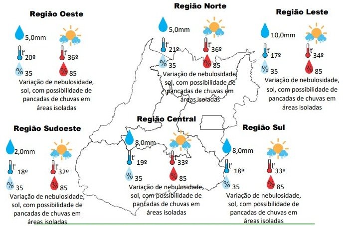 Terça-feira, com variação de nebulosidade e sol, mas a combinação calor e umidade vinda da região norte do Brasil, vai favorecer a formação de pancadas de chuvas em áreas isoladas e algumas regiões de Goiás. Capital: predomínio de sol com possibilidade de pancadas de chuvas em áreas isoladas, temperatura máxima podendo chegar aos 32ºC e umidade relativa do ar variando entre 35% a 85%, o nascer do sol será às 06:26hs e o pôr do sol às 18:10hs.