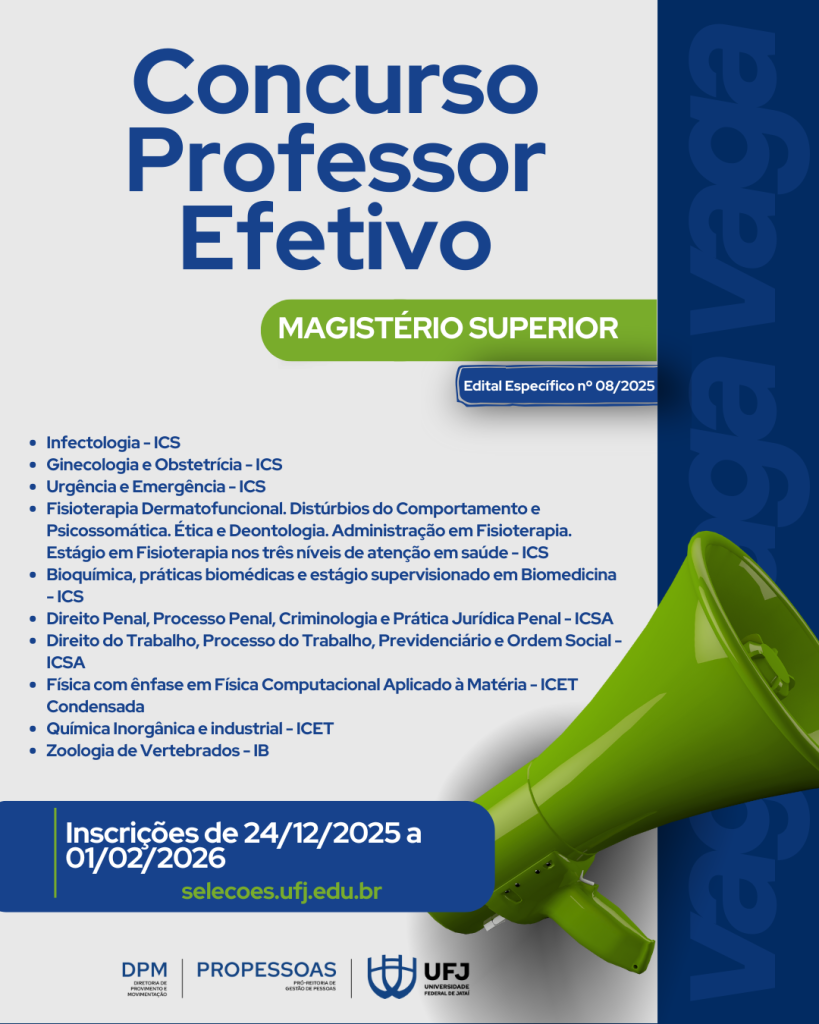 As inscrições estarão abertas no período de 24 de dezembro de 2025 a 1º de fevereiro de 2026, exclusivamente por meio do sistema eletrônico de seleções da UFJ, disponível no endereço selecoes.ufj.edu.br.